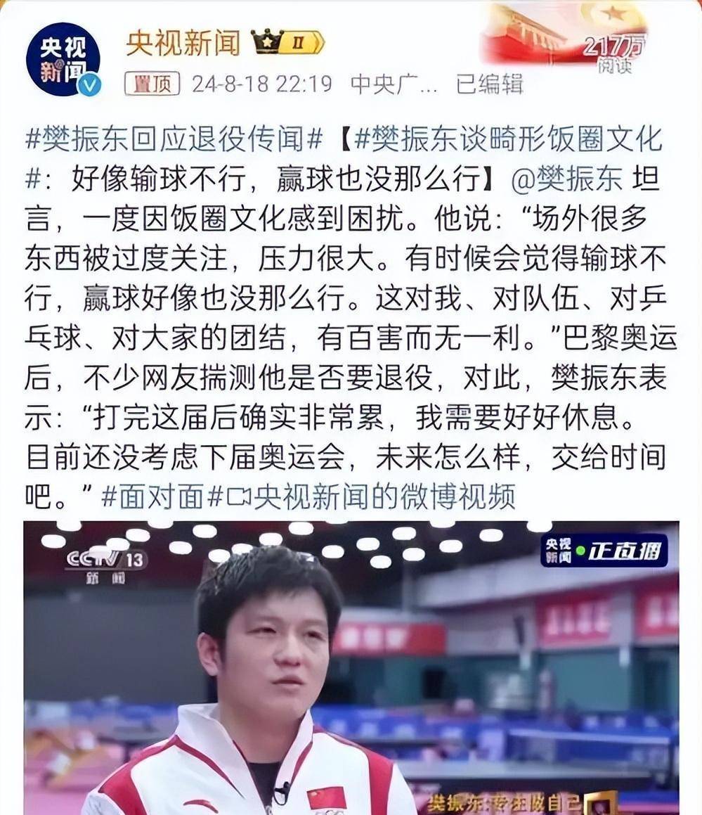 比如樊振东,当初选择退出世界排名、开个人演唱会的时候,就遭到了不少非议;后来加入德国俱乐部,也引发了争议。